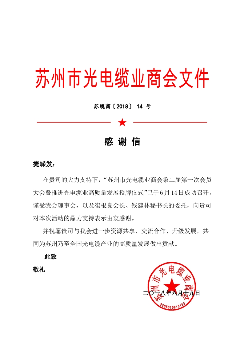 會議以“新時(shí)代、新征程、新使命”為口號,以“搶抓新時(shí)代機(jī)遇、聚優(yōu)高質(zhì)量發(fā)展”為主題展開匯報(bào),會議結(jié)束后,捷嶸發(fā)收到來著蘇州光電纜商會的感謝信: